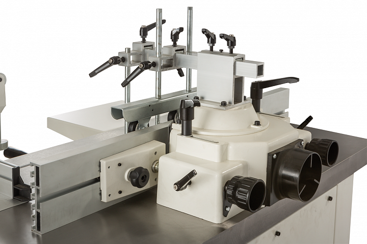 Для работы на основном столе предназначен фрезерный упор, удобный в настройке и точный. На чугунном корпусе, который служит также ограждением фрезы и пылесборным кожухом, закреплён регулируемый верхний прижим, снабжённый обрезиненными роликами, снижающими трение. Подающий и приемный упоры из алюминиевого профиля регулируются по-отдельности при помощи вращающихся рукояток.
