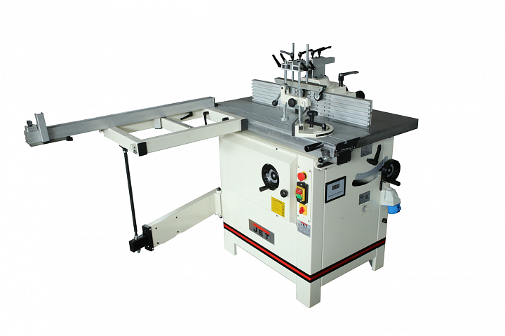 Jet JWS-2600 – современный универсальный фрезерный станок, оснащённый подвижным столом (кареткой), которая может быть укомплектована расширением с телескопической опорой. Подвижный стол выполнен из алюминиевого профиля и установлен с отступом от фрезы. В комплект поставки входит небольшой стальной расширитель каретки, упор заготовки с возможностью поворота и удобный эксцентриковый прижим. Устанавливаемый в качестве опции расширитель с телескопической опорой укомплектован более длинным упором, который также можно устанавливать под углом (есть и разметка в градусах).