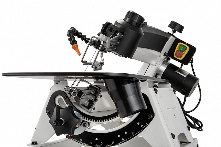 Станок оборудован параллелограммным механизмом привода качающейся части, имеющим ряд особенностей. Во-первых, верхняя часть рамы поднимается, что удобно при наладке или установке заготовки. В верхнем положении она фиксируется и не требует удерживания. Нижнее положение можно корректировать вращением рукоятки, подстраивая под длину пилки и толщину детали. Во-вторых, предусмотрен режим работы с продольной подкачкой полотна (так называемый маятниковый ход), который обеспечивает более «агрессивное» и производительное пиление. В зависимости от требований к скорости, точности и чистоте распила настраивают амплитуду продольных движений в диапазоне от нуля и до максимальной величины. Процедура выполняется поворотом моторного модуля вокруг оси.