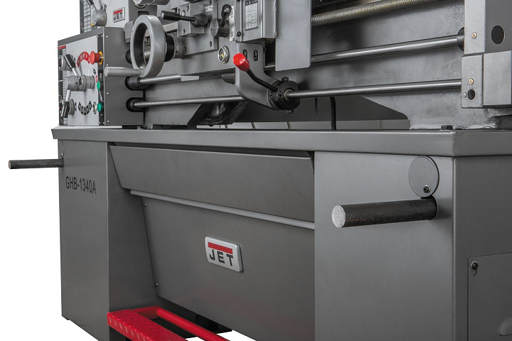 GHB-1340A DRO выполнен по двухвинтовой схеме. Для нарезания резьбы используется ходовой винт, для автоматического точения - ходовой вал. На станке возможна регулировка зазоров направляющих при помощи клиновых планок, конструкция задней бабки позволяет обтачивать конические заготовки. Для облегчения механического переключения режимов на GHB-1340A DRO применяется толчковый (импульсный) режим пуска двигателя.