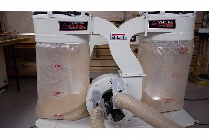 Jet DC-1900A — высокопроизводительная вытяжная установка со сдвоенными фильтрами и накопителями, поставляется с трёхфазным двигателем большой мощности. Разветвитель аспирационного патрубка позволяет подключать при помощи 100-миллиметровых рукавов до трёх точек пылесбора или, если требуется, один единственный рукав диаметром 150 или 200 мм. «Улитка» и крыльчатка выполнены из стали и не боятся повреждений сучками или щепой, которые попадаются в отходах деревообработки.